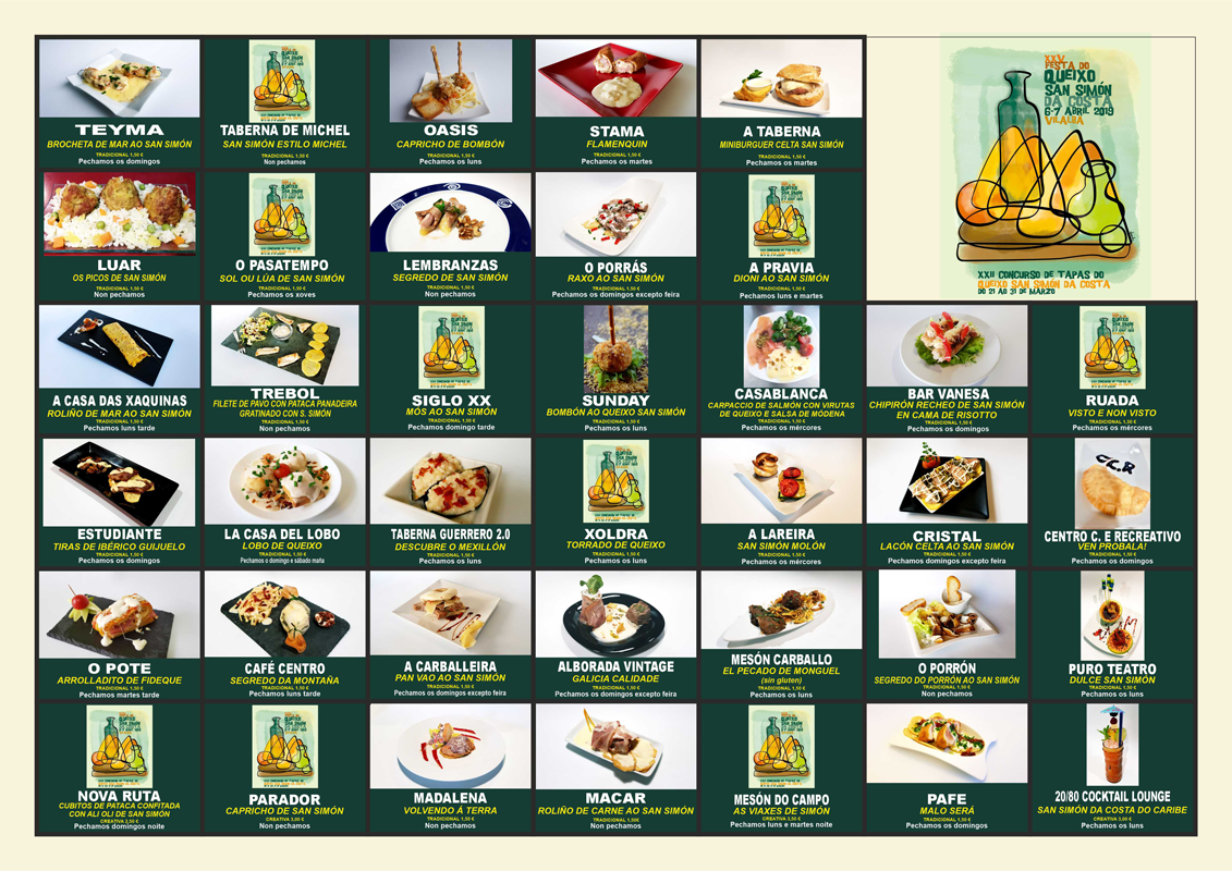 X Concurso de Tapas con queso San Simón da Costa en Vilalba, del 16 al 26 de Marzo (ambos inclusive). Como parte del programa de la Fiesta del queso San Simón da Costa; que tendrá lugar los días 1 y 2 de Abril, 39 establecimientos de la localidad ofrecerán sus tapas con dicho queso como protagonista dentro de dos categorías diferenciadas: Creativa y Tradicional.